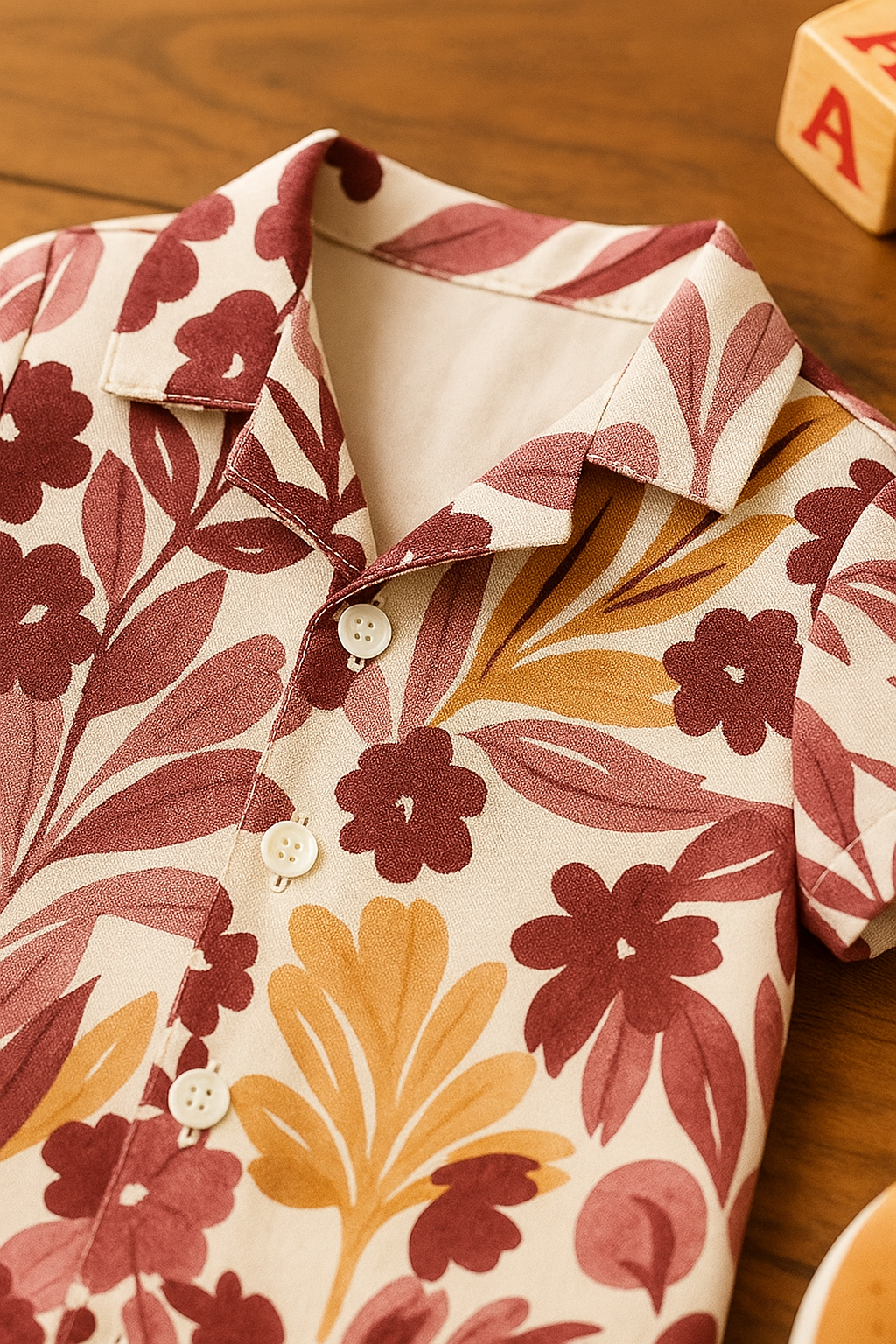 The shirt features a short sleeve design, a soft collar, and a button-down front that’s quick to manage. The print is a mix of deep red and warm earth tones that gives your child a cheerful, stylish look without being too bold. The fabric is soft and breathable, so it’s comfortable to wear through the day.