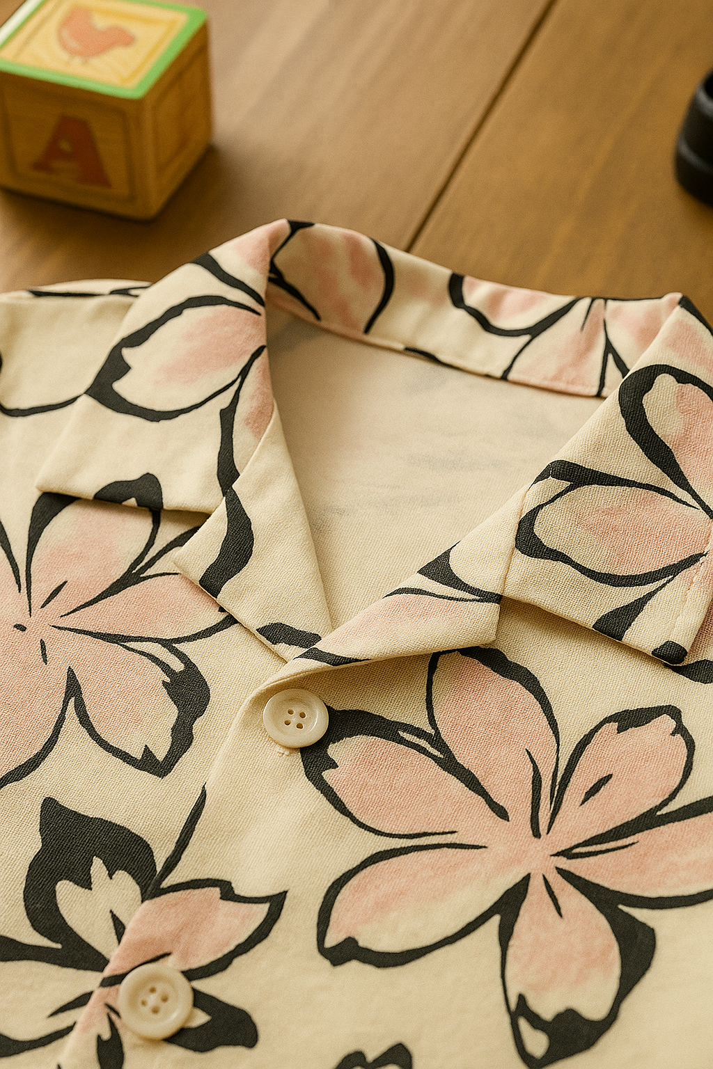 The shirt has short sleeves, a relaxed collar, and a button-down front, making it easy to put on and take off. The fabric is soft and light, so your child stays cool and comfortable. The pink and black floral print adds a cheerful touch that’s playful without being too loud.
